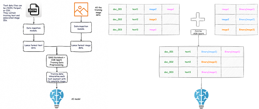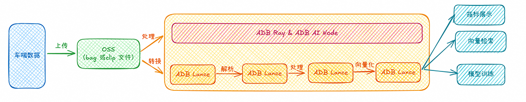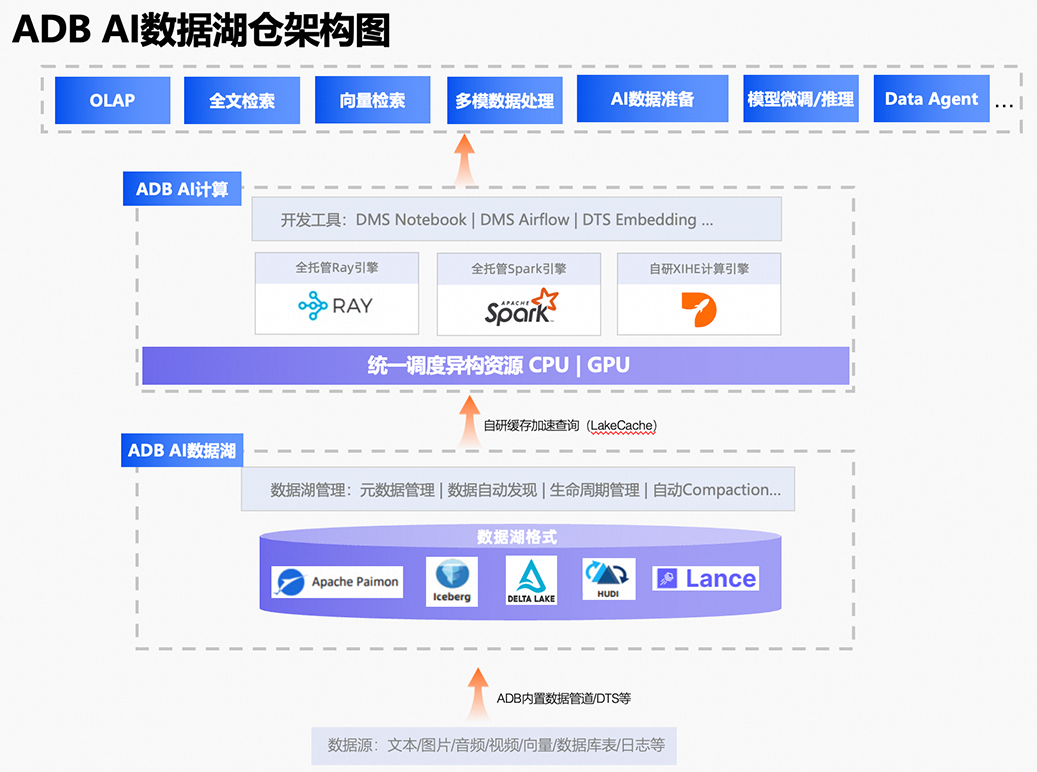 ADB存储层通过引入AI原生的Lance数据格式,并结合上层托管的ADB Ray和ADB Spark计算引擎,将多模数据ETL与ML一体化,更高效地构建和优化AI流水线。