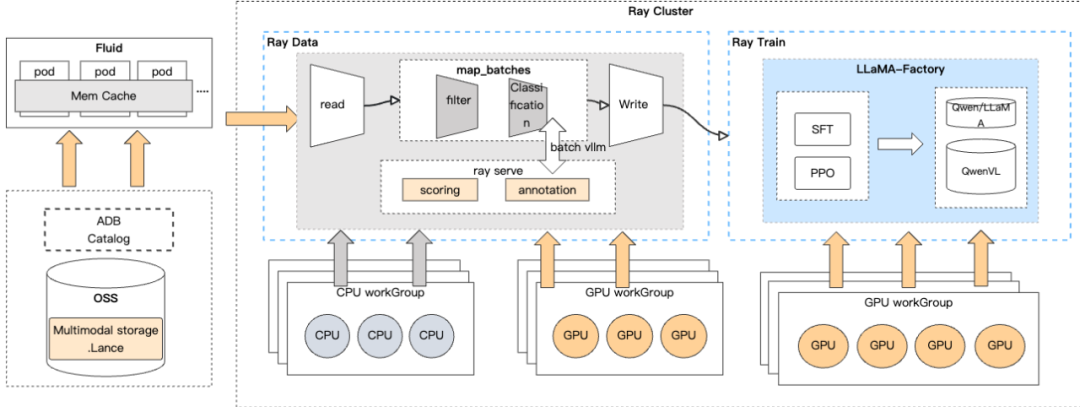 利用Lance零成本schema演进特性,实现高效加列,无需重写数据文件,新增小文件即可;在客户场景测试中,与采用Parquet对比,性能提升3倍+。 通过ADB Ray工具链,一站式完成数据处理、打标和微调。