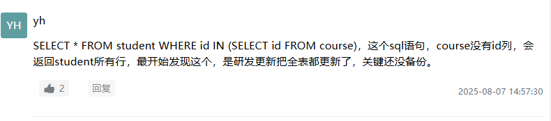 像这位同学的留言,应该就是研发没先执行查询,直接更新导致全表数据被错误更新了。
