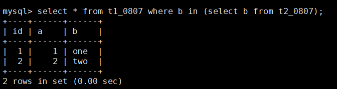 CREATE TABLE `t1_0807` (`id` int NOT NULL AUTO_INCREMENT,`a` int DEFAULT NULL,b varchar(10),PRIMARY KEY (`id`),KEY `idx_a` (`a`)) ENGINE=InnoDB;CREATE TABLE `t2_0807` (`id` int NOT NULL AUTO_INCREMENT,`c` int DEFAULT NULL,PRIMARY KEY (`id`)) ENGINE=InnoDB;