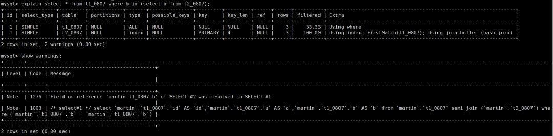 select#1 */ select `martin`.`t1_0807`.`id` AS `id`,`martin`.`t1_0807`.`a` AS `a`,`martin`.`t1_0807`.`b` AS `b` from `martin`.`t1_0807` semi join (`martin`.`t2_0807`) where (`martin`.`t1_0807`.`b` = `martin`.`t1_0807`.`b`