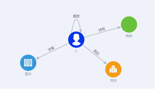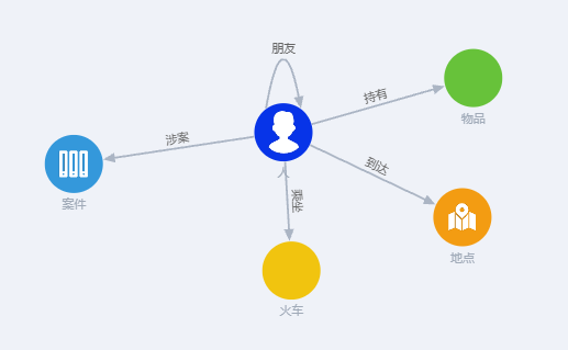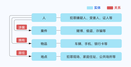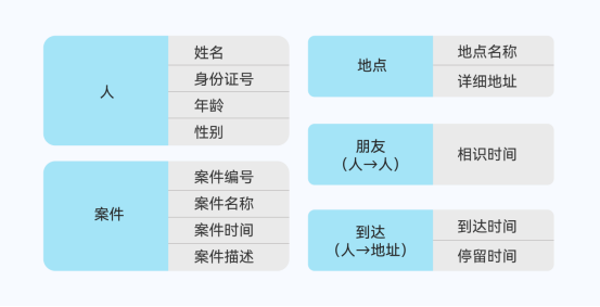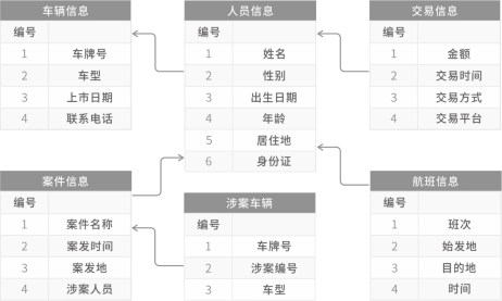 公安案件通常会涉及到人、地、事、物等相关信息,将案件、人、车辆、交易、航班抽象为五类实体。每个实体都有其相关的附加属性,比如人的姓名、性别、年龄等。实体间各有关系,例如人“拥有”车辆,车辆“涉及”案件。