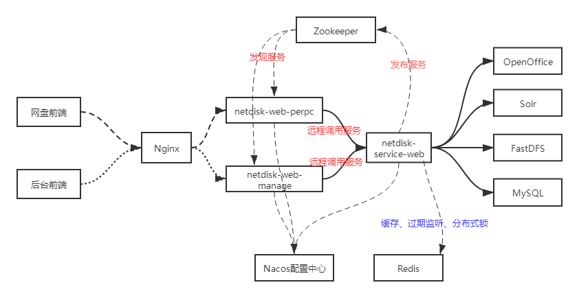 上面的架构图,是网盘系统的真实架构了,可以清晰的了解到项目的部署架构和涉及的技术栈。