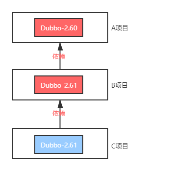 第一:C 项目依赖 B 项目;B 依赖 A 项目,则 C 项目的 Dubbo 以 B 项目的 Dubbo 版本为主。