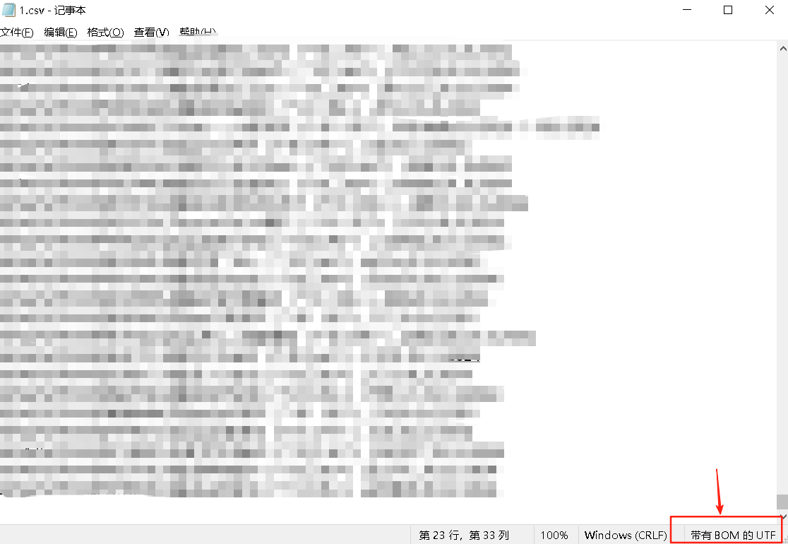 如果显示的不是带有BOM的UTF-8,需要将记事本打开的csv文件另存为编码为UTF-8,保存后再次打开右下角就会显示成带有BOM的UTF-8.