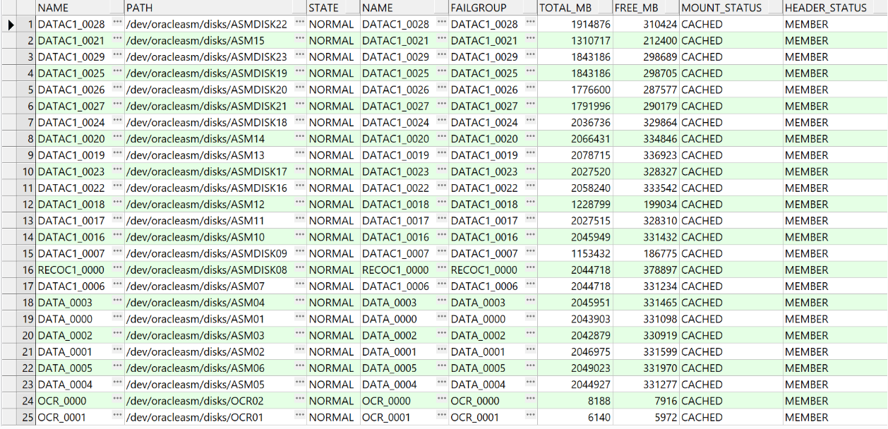 select name,path,state,name,failgroup ,total_mb,free_mb,mount_status,header_status from v$asm_disk;