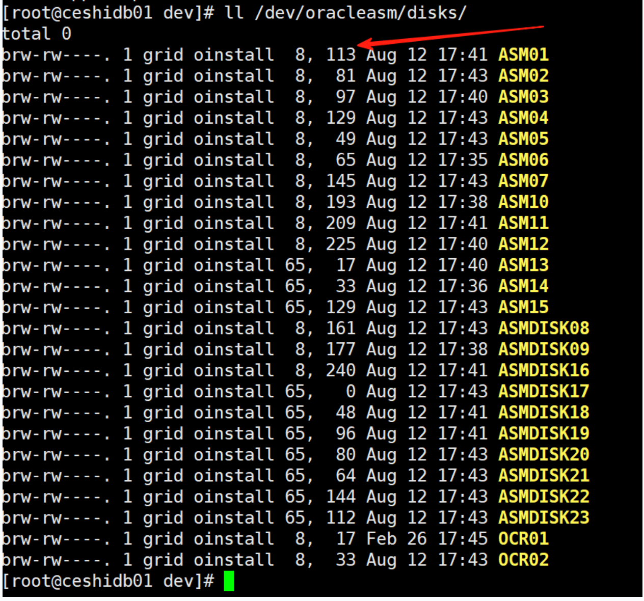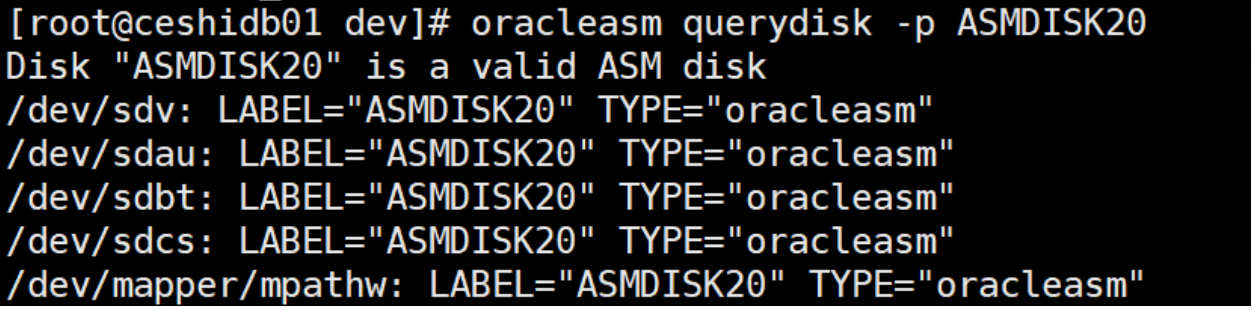 通过oracleasm工具查询对应的磁盘组中的磁盘,并且可以看到多路径下的具体磁盘信息
