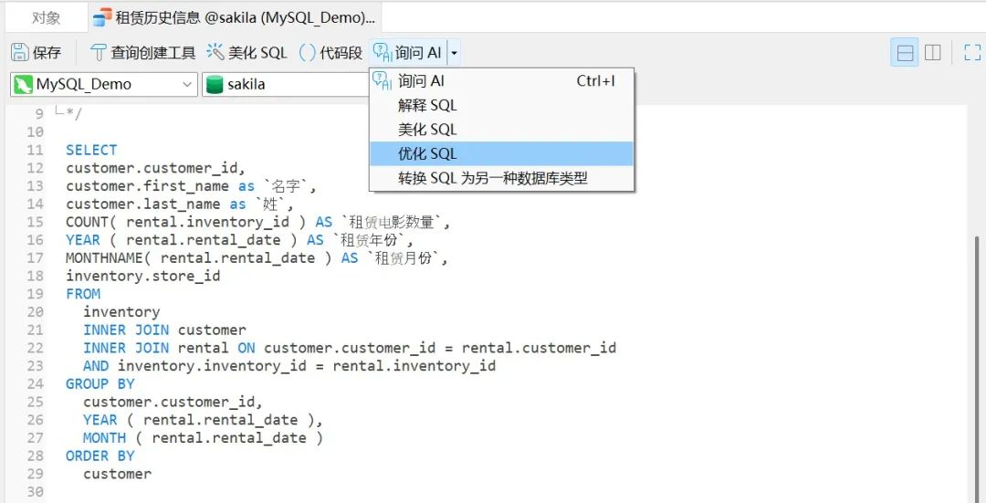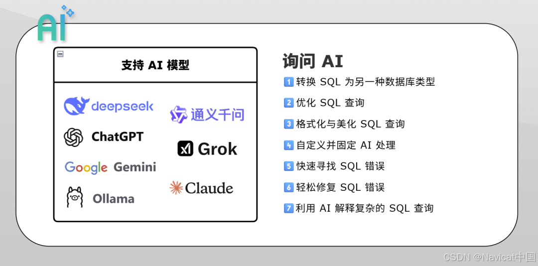 近期,我们发布了 Navicat 17.3 版本。这一版本实现了全方位升级,包括对 AI 功能大升级、支持达梦、金仓、瀚高、支持阿里通义千问等 AI 大模型,支持凝思 OS 以及多项 UI 改进。今天,我们将深入介绍 Navicat AI 功能之“询问 AI ”- 优化 SQL 查询。🤗