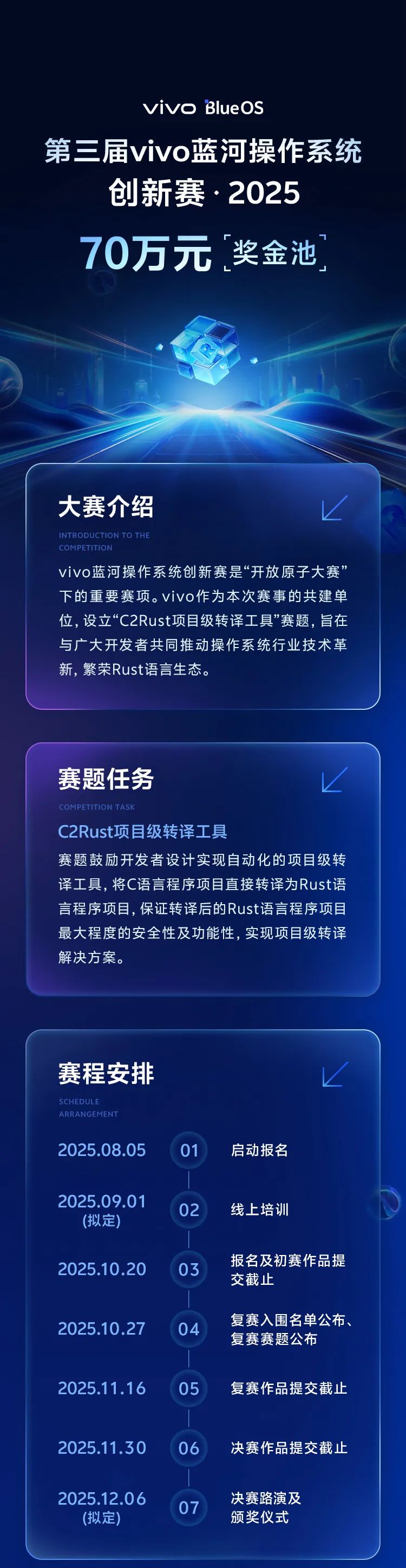 由开放原子开源基金会主办,vivo联合共建的开放原子大赛-蓝河操作系统创新赛首届赛事于2023年11月启动。目前,蓝河创新赛已连续举办三届,吸引了众多开发者参赛。在去年的第二届大赛中,报名参赛队伍超过600支,覆盖近90所顶尖高校,部分优秀作品实现了从C/C++语言到Rust语言的片段级代码转译,跃升至文件级转译的效果,并初步具备了项目级转译的能力,对C/C++语言与Rust语言规模化的项目级转译这一行业难题的深度探索具有极大的意义。