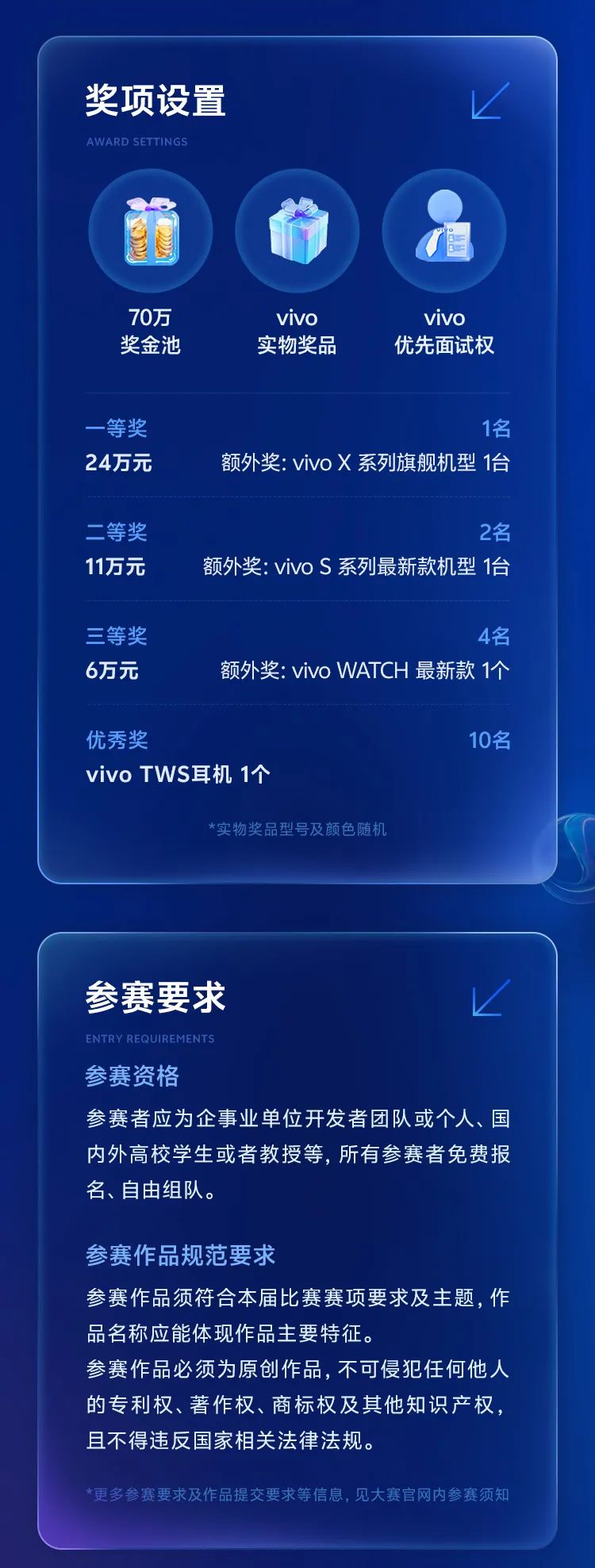 目前,报名已正式开启。vivo将于9月举办赋能培训,为参赛者提供赛制讲解与答疑;由专业评委在10月、11月分别进行初赛、复赛评审,并公布入围复赛、决赛名单;12月举行决赛路演及颁奖。