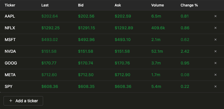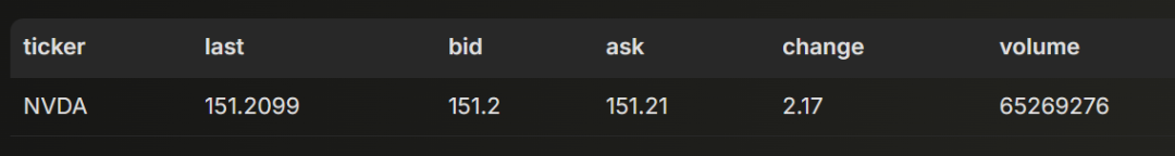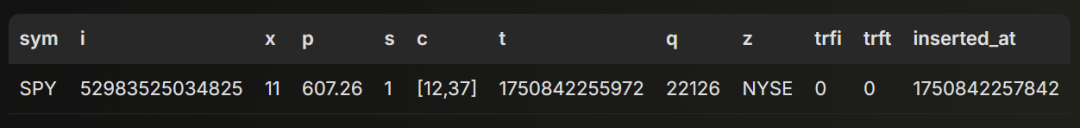 当数据写入 ClickHouse 后,搭建可视化层就相对容易了。真正的难点在于如何编写合适的 SQL 查询。下面我们来介绍如何实现,并重点解析支持两个核心可视化所需的查询。第一个可视化是一个实时更新的表格,用于持续展示某只股票的最新交易数据。