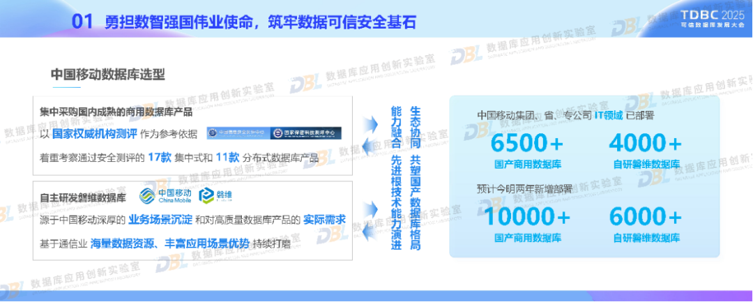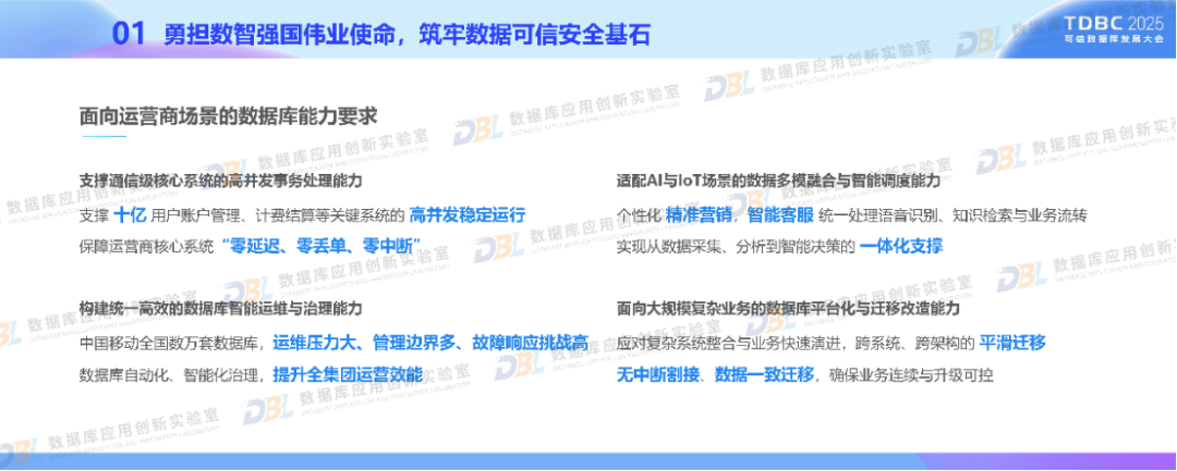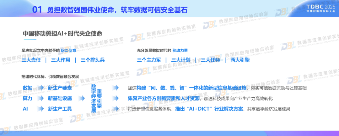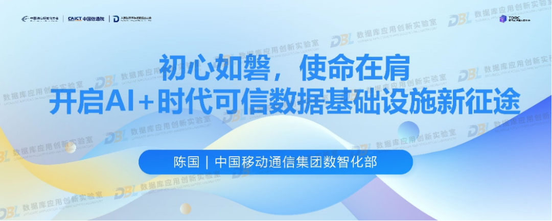 为推动我国数据库产业自立自强高质量发展,2025年7月16日,“2025可信数据库发展大会”主论坛在北京隆重召开。会上,中国移动集团数智化部副总经理陈国发表题为“初心如磐,使命在肩——开启AI+时代可信数据基础设施新征途”的主题演讲,全面阐释中国移动在“AI+”浪潮下构建可信数据基础设施的战略思考与实践路径。