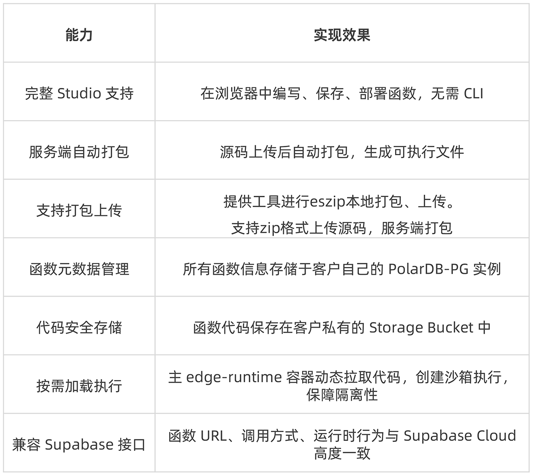 因此,PolarDB Supabase 在公有云托管环境下,采用独立实例(Isolated Instance)架构,并自主研发轻量级 FaaS 管理系统,成功补全了开源版 Supabase 缺失的最后一块拼图——Edge Functions。