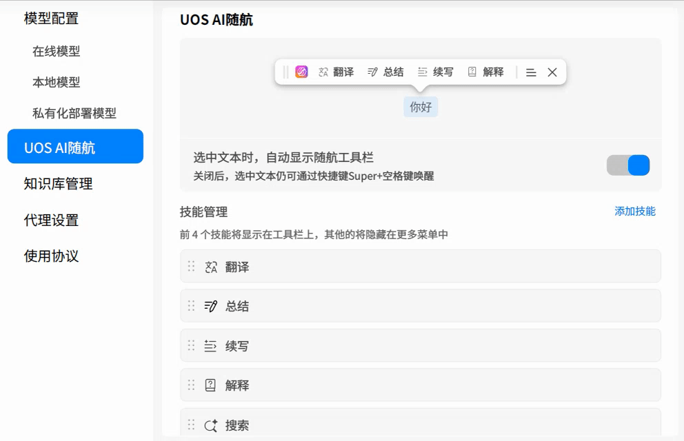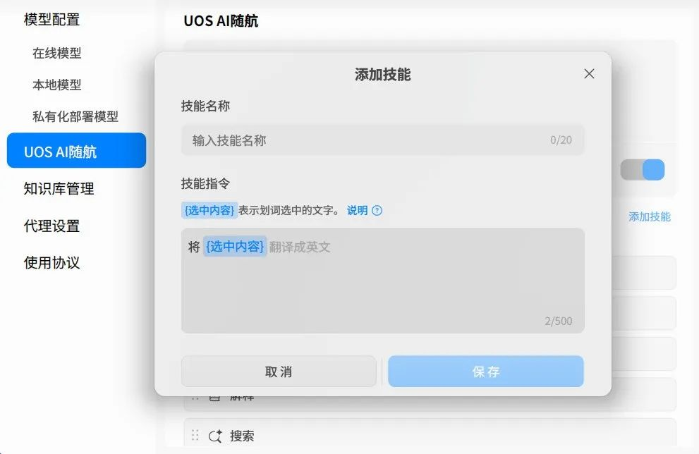 UOS AI 随航支持“个性化技能添加”。你可以根据自己的工作场景,为它赋予新的“能力”,比如“公文校对”、“数据查询”等,让 UOS AI 随航真正贴合你的工作需求,成为你工作中的得力帮手。