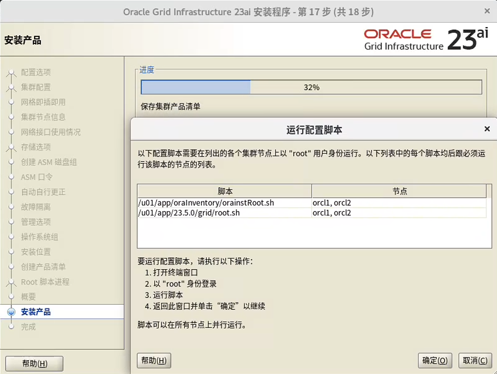 [root@orcl1:/root]# /u01/app/23.5.0/grid/root.sh