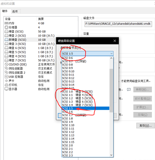 scsi1.SharedBus 指定的是总线为1的所有盘,如果想指定单个盘1:1,则修改为 scsi1:1.SharedBus。