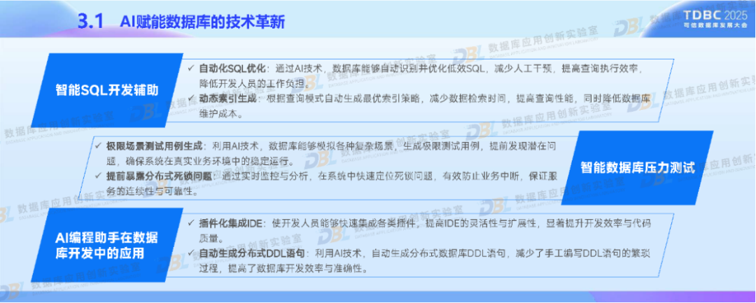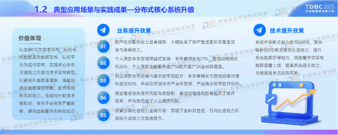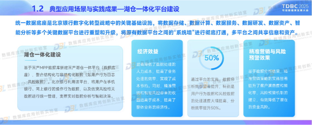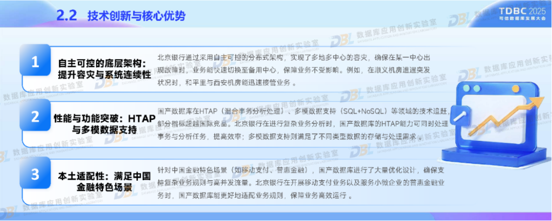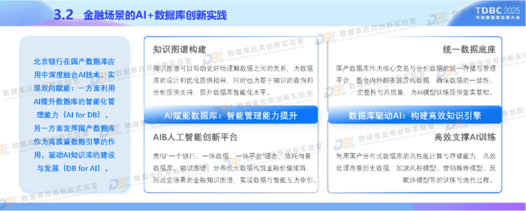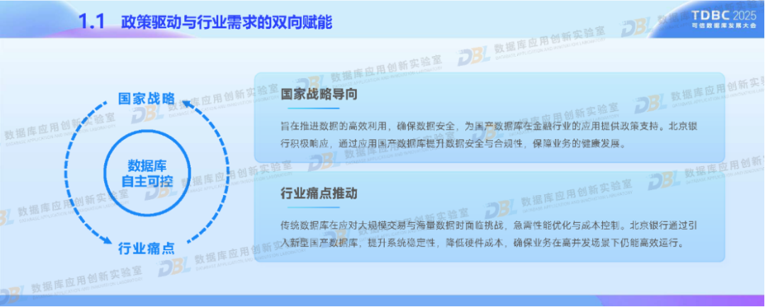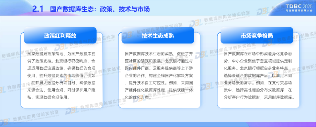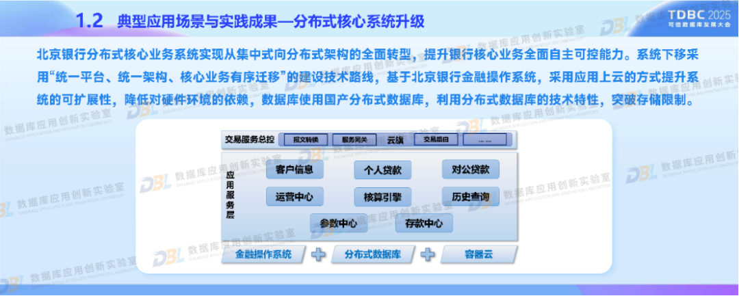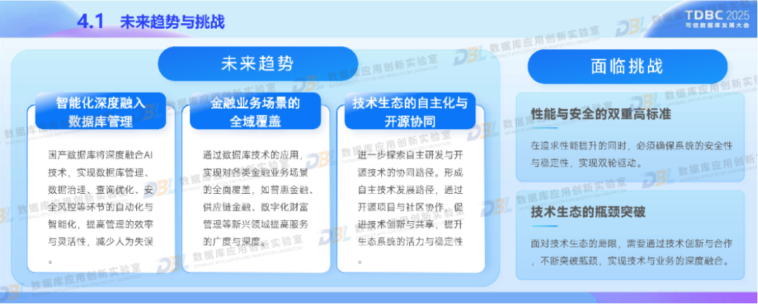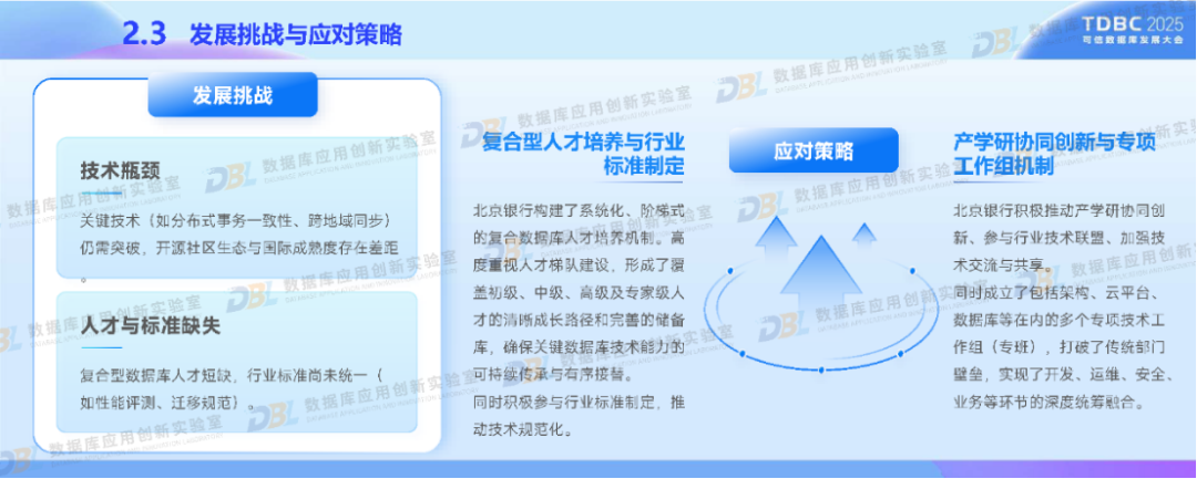 在政策驱动与行业需求下,北京银行积极应用国产数据库推进金融业务转型。通过分布式核心系统升级和湖仓一体化平台的建设,采用自主可控的分布式架构、多模数据支持等核心技术,以满足我国金融特色场景。同时,深度融合AI技术,构建金融知识图谱与统一数据底座。未来,北京银行还将推动数据库智能化、覆盖全域金融场景,促进技术生态自主化与开源协同,助力数据库产业高质量发展。