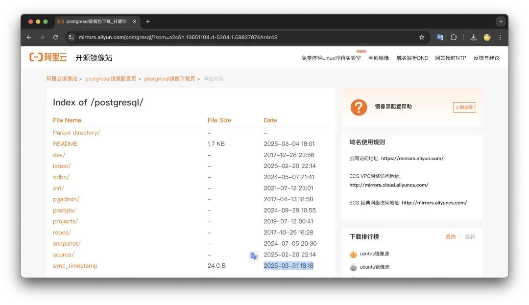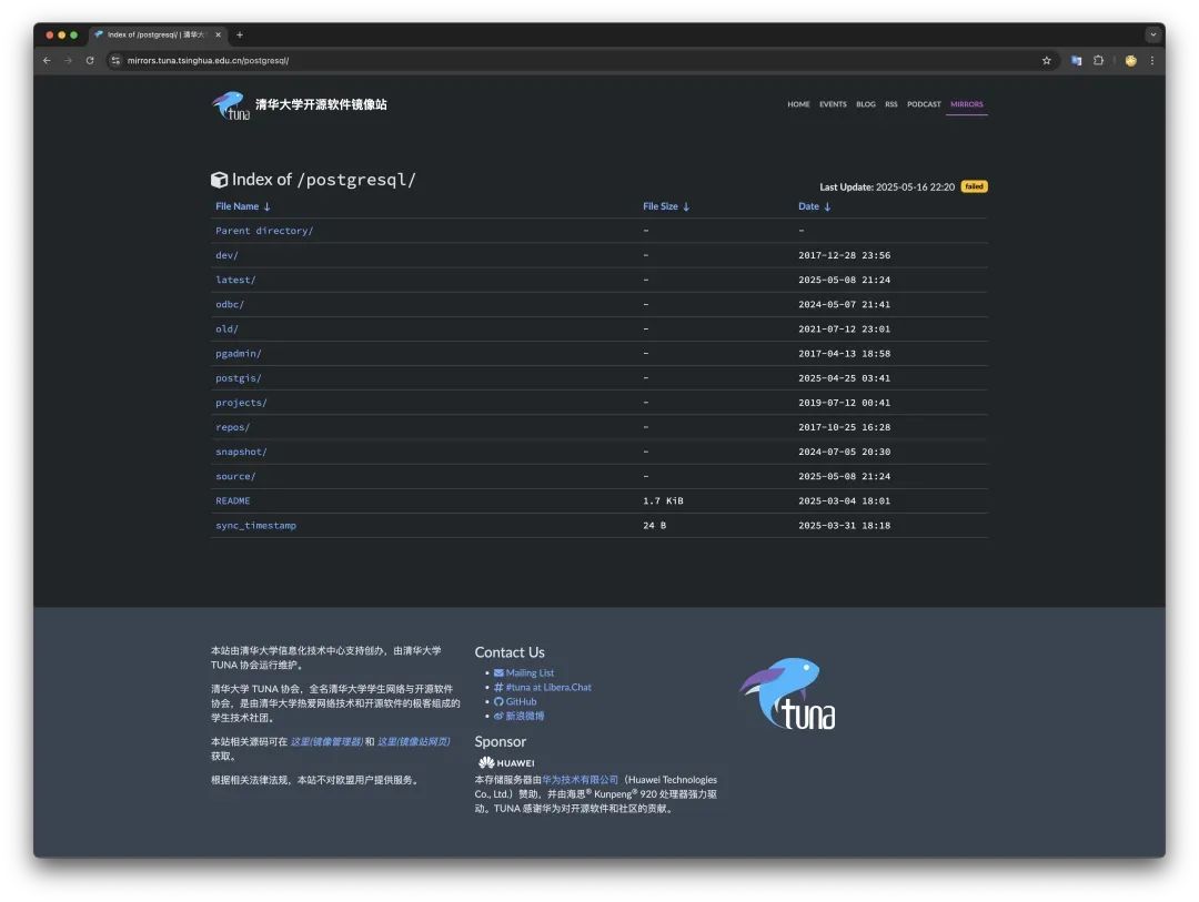 中国用户想要 YUM/APT 安装 PostgreSQL 一般只能通过国内的镜像站来安装,最知名的应该是阿里云和清华大学的Tuna镜像站,当然还有浙大/中科大的源。不幸的是,这些镜像站无一例外全都躺平了,并没有体现出担当来 —— 但你也没法怪他们,毕竟免费嘛。