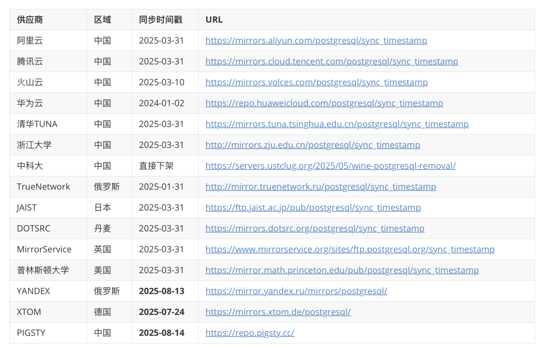 不幸的是,PGDG (全称:PostgreSQL 全球开发组)的 APT YUM 软件制成品仓库在今年五月中旬对外关闭了 ftp 与 rsync 同步通道, 这导致了几乎全球的镜像站点都与上游仓库失去同步,存放的都是几个月前的旧版本软件包。