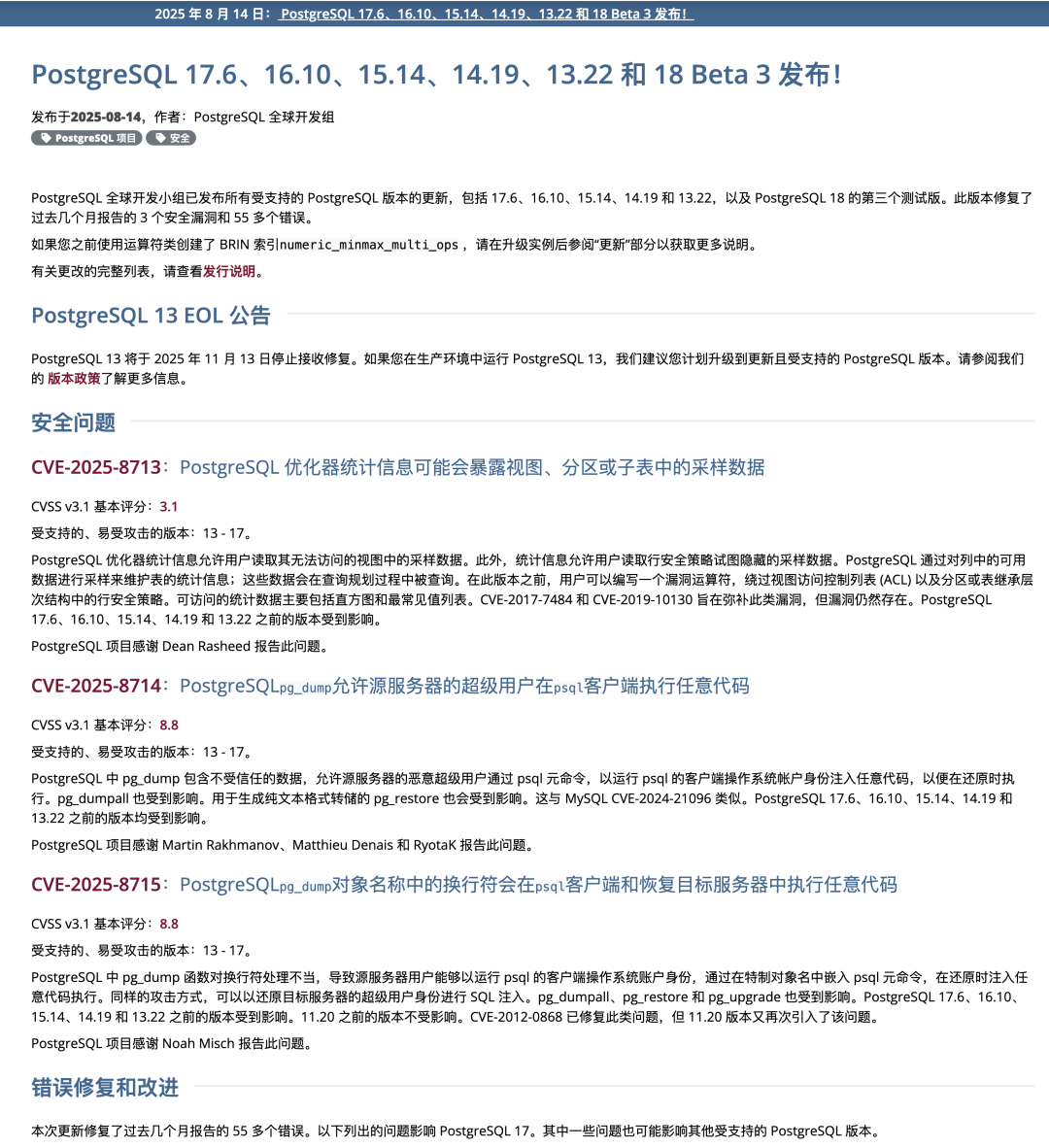 比如,17.5 等5月更新版本修复了 CVE-2025-4207[4] GB18030 相关漏洞,而今天刚刚发布的 17.6 系列版本[5] 更是修复了 3 个 CVE 和 55 个 BUG。如果你是镜像站的用户,那么就没法及时更新跟进打补丁了。更别提下个月即将发布的 PostgreSQL 18 新大版本了。现在还属于问题早期阶段,也就落后两个 PG 小版本,但很快再过一个月就会落后一个大版本。然后各种积累的漏洞补丁,安全修复国内用户全都用不上,产生的暴露风险会越来越大
