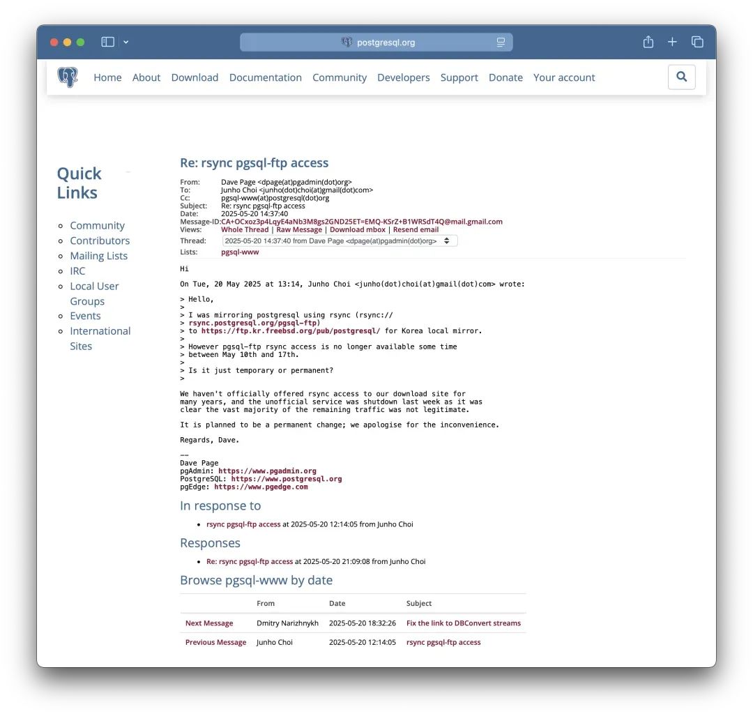 PostgreSQL 邮件列表里,5月20日有韩国镜像站的维护者问过这个问题,之前用 rsync 同步 PGDG 官方仓库怎么突然断了?