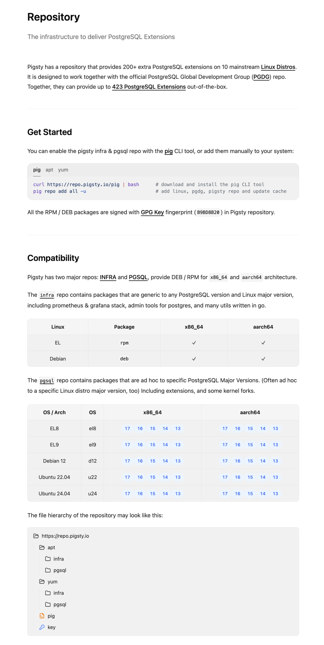 老冯自己独立维护了一个 PostgreSQL 扩展仓库,里面包含了 9 种风味的 PG 内核,以及两百多款 PG 扩展(加上 PGDG 的总共 423 个可用扩展)。目前是 全世界 PG 生态收录最多可用扩展制品的仓库了。不谦虚的说,说起 PostgreSQL 打包构建,我和 Devrim(YUM 仓库),Christoph(APT 仓库),Álvaro(OCI 仓库),David Wheeler(PGXN) 是这个赛道的顶级玩家与原始供应者。