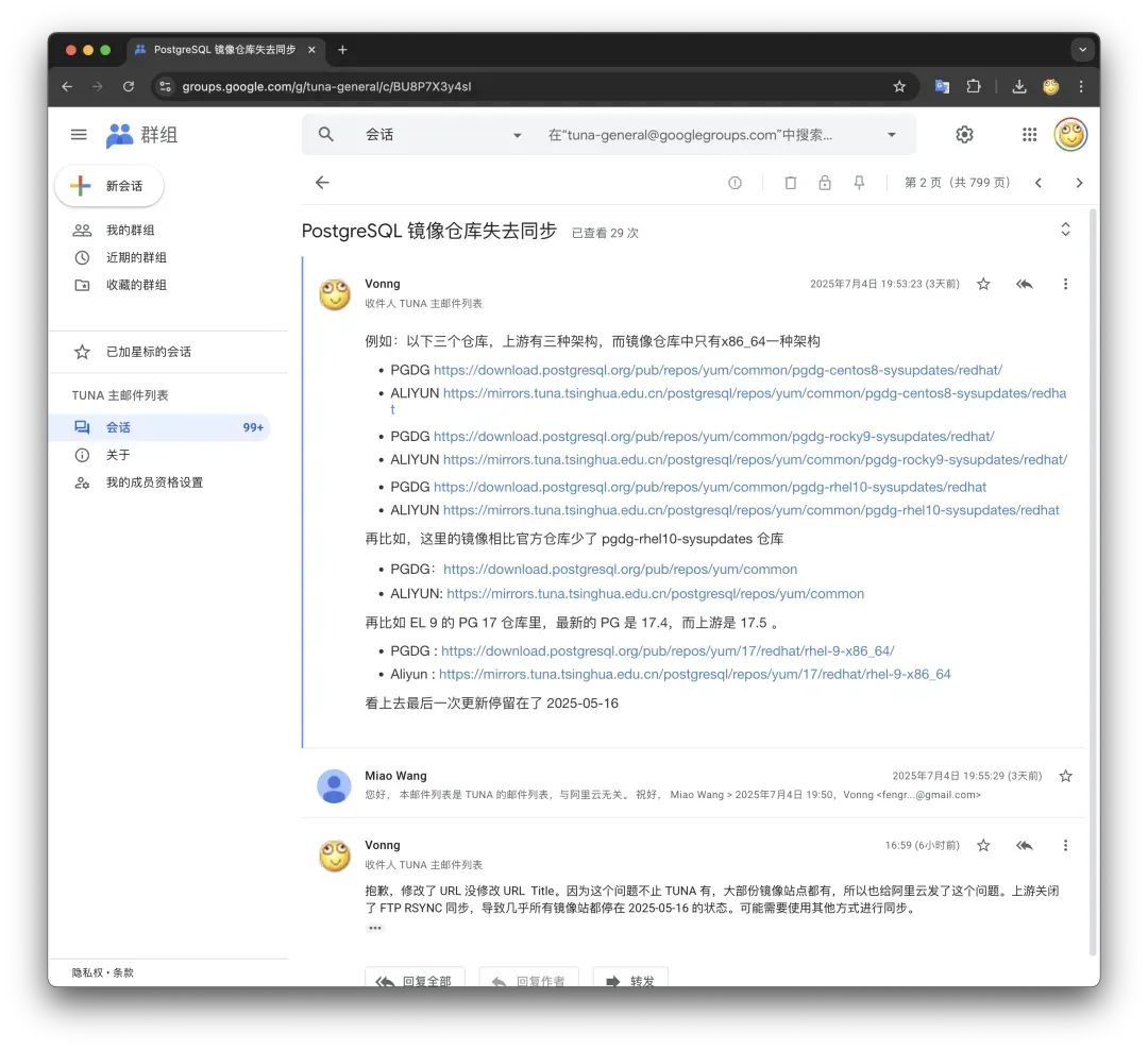 老冯在发现这个问题的时候,第一时间就给阿里云和清华TUNA的邮件列表上报了这个问题,也跟德哥聊过说过。不幸的是,几十天过去了,依然毫无波澜,没有丝毫动静。就是没人有这个担当,能站出来解决这个问题。老冯对国内这些云厂商和数据库厂商和高校镜像站的维护团队真的非常失望。但你也没法说人家 —— 对吧,人家毕竟是免费给你用的,你能说什么呢?