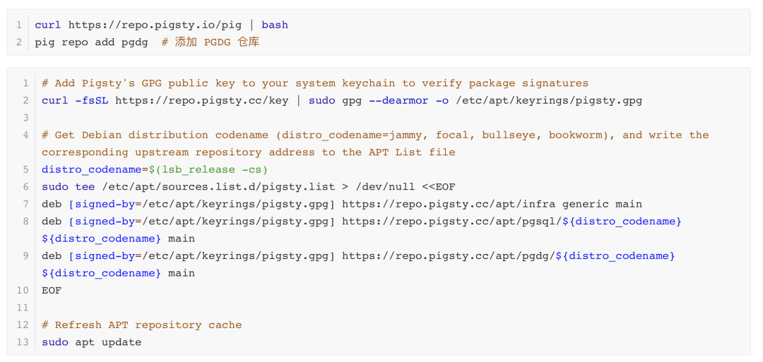 例子:使用 pig 添加仓库,或者直接添加 APT 仓库(YUM 同理)