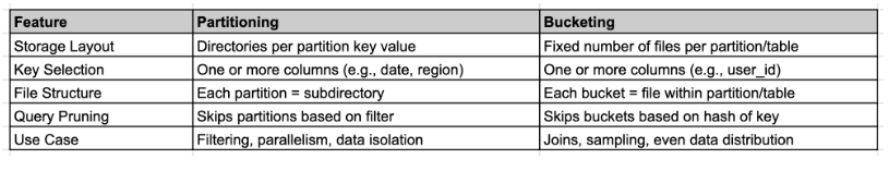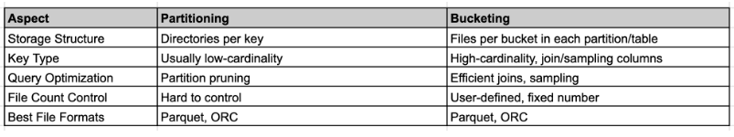 对频繁用于连接或聚合的列使用分桶。 根据数据大小和查询模式选择桶的数量;过多的桶会导致小文件和低效。 将分桶与分区结合使用,实现更精细的数据组织。