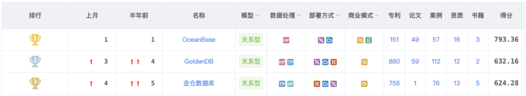 本月排行榜最大的看点集中在前三甲位置的更替。OceanBase持续强势领跑,稳居榜首;GoldenDB自5月以来实现连续两位跃升,本月成功夺得榜眼;金仓数据库凭借技术新品和生态创新,从第四位再次挺进前三。
