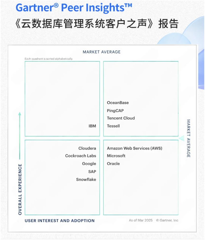 近期,OceanBase 荣登 Gartner 发布的《2025年云数据库管理系统“客户之声”》报告,凭借4.8/5的总体评分和84%的推荐率,连续两年获评“客户之选”,并跻身全球“卓越表现者”象限。该荣誉使其与 Redis、Google Cloud Spanner 等国际顶尖产品比肩,充分彰显了 OceanBase 在技术实力与客户满意度上的领先地位。