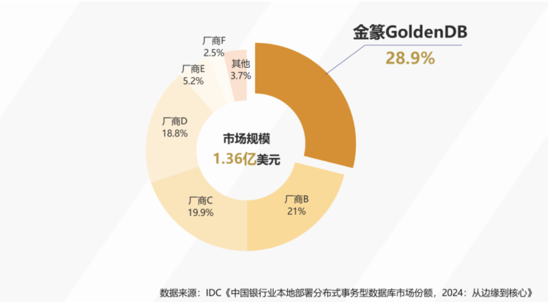 在市场和行业层面,GoldenDB荣登赛迪顾问《2024-2025 中国平台软件市场研究报告》分布式事务型数据库市场榜首,并被评为中国数据库管理系统市场领导者。同时,IDC发布的《中国银行业本地部署分布式事务型数据库市场份额(2024)》报告显示,GoldenDB蝉联银行分布式数据库本地部署市场第一,市场占比达28.9%。