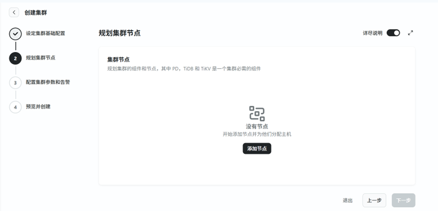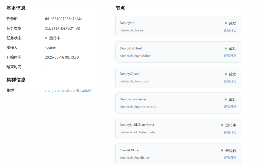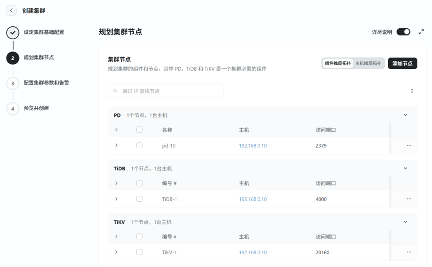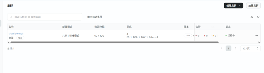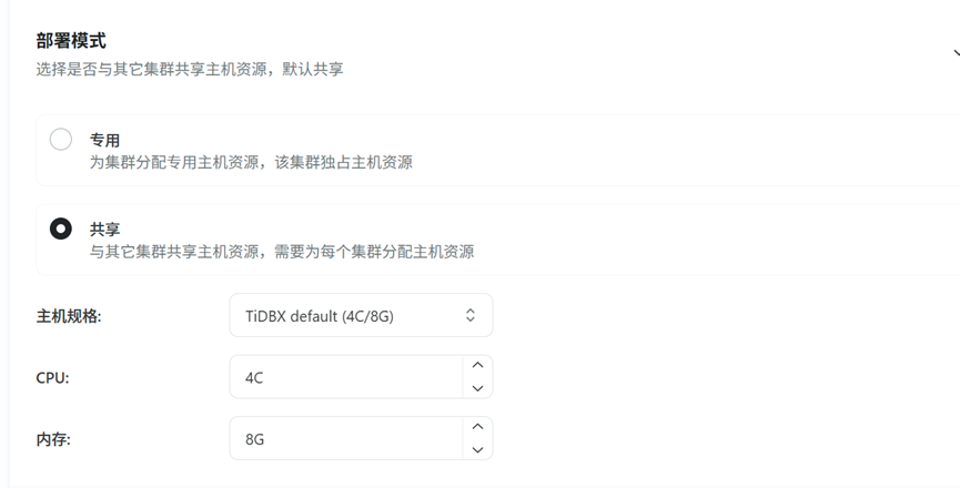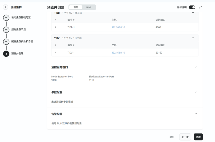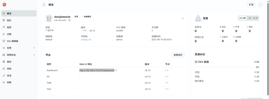 TEM可视化集群创建:相比手动 tiup 部署,TEM 提供 GUI 界面,支持参数化配置(如 PD/TiKV/TiDB 节点数、资源配额等)。以及开箱即用的监控面板:集成 Prometheus + Grafana,提供丰富的 TiDB 关键指标(QPS、延迟、资源使用率等)。同时TEM 控制平面(管理服务)占用约 2-4 CPU 和 4-8GB 内存,对生产集群影响较小。