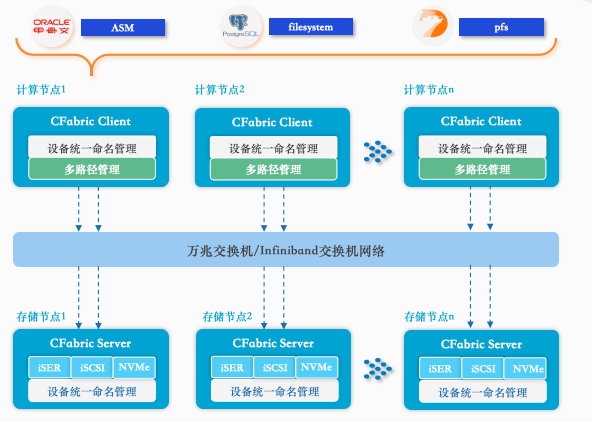 CFabric高速存储互联软件是一个基于高速网络传输的软件,它将对存储设备高并发、低延迟IO请求同步到远程设备上。基于RDMA协议实现,通过零复制网络技术和内核内存旁路技术减少服务器CPU耗费,高效快速地实现了数据传输协议。