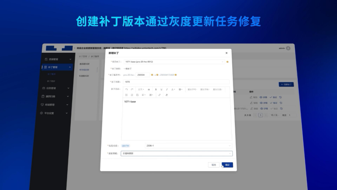 统信企业级更新管理系统作为面向政企客户内网环境部署的核心工具,不仅能支撑系统版本更新,还可应用于漏洞补丁修复等护网场景,成为保障系统高效运维的关键助力。