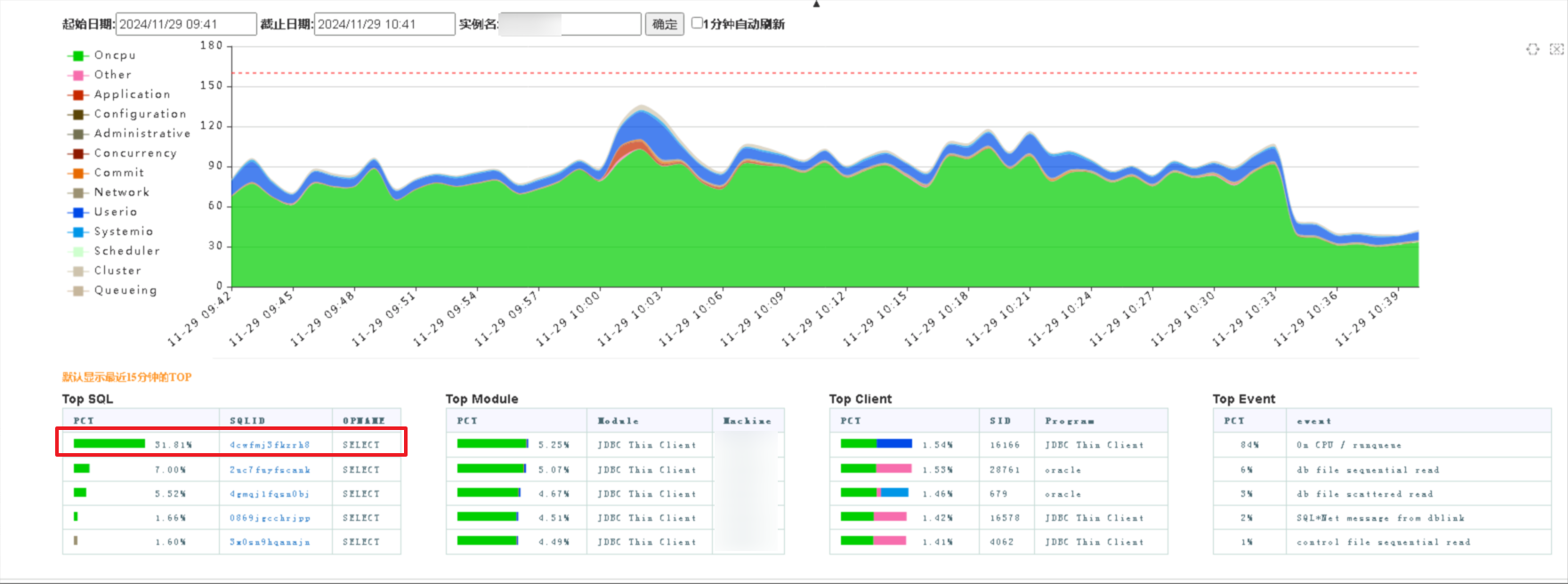 -- 默认显示最近15分钟的TOP SQL
