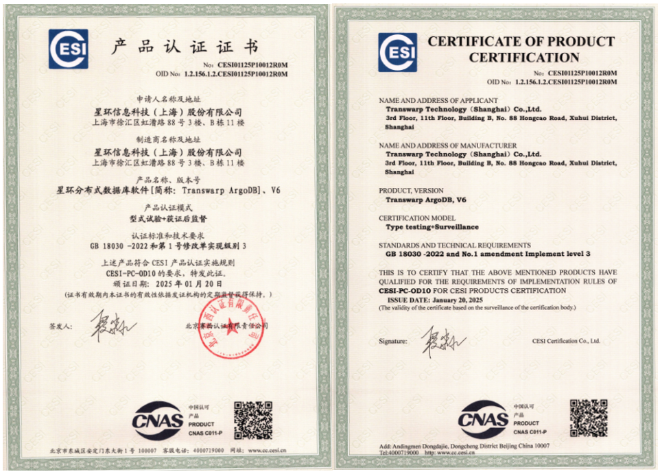 近日,星环科技分布式式数据库软件Transwarp ArgoDB通过GB 18030-2022《信息技术 中文编码字符集》强制性国家标准的最高实现级别(级别3)认证。