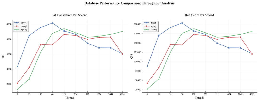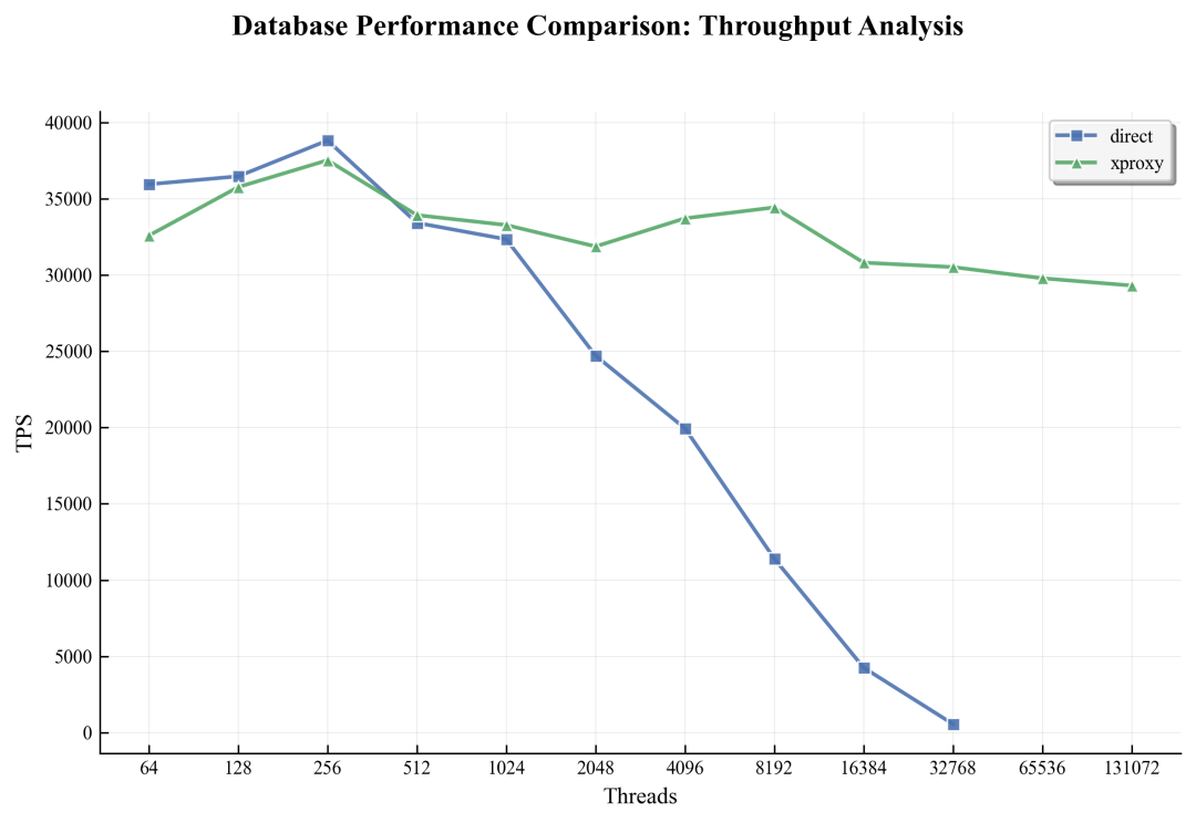 传统认知中代理层必然引入性能损耗,而XProxy通过架构优化与高效通信机制,将转发开销压缩至最低。在轻量级OLTP短查询场景中,当数据库处理时间较短时,XProxy整体性能表现优于直连模式。Sysbench标准测试(20表×200万记录)显示:中高并发下,XProxy的吞吐量(QPS/TPS)显著高于因连接枯竭导致性能衰减的直连数据库。