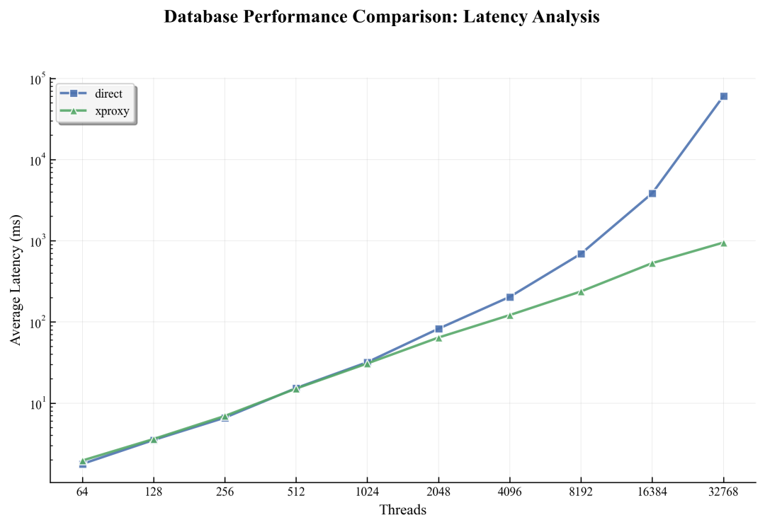PostgreSQL原生连接管理在大规模并发下资源消耗巨大,连接创建/销毁极易成为瓶颈。XProxy采用多线程+协程调度架构:每个客户端连接由轻量级协程处理,协程在多个工作线程上动态调度。凭借协程切换的极低开销与多核并行能力,XProxy可稳定支撑数万级客户端并发连接。极端测试表明,在数万并发压力下,TPS波动始终控制在10%以内。