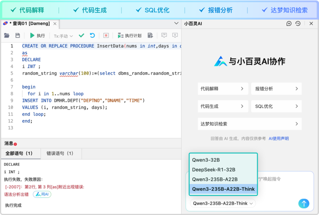 6 月 SQLark 发布了集成 Qwen3-32B 和 DeepSeek-32B 模型的小百灵 AI 助手。本次 V3.6 新增千问旗舰模型 Qwen3-235B,帮助用户在使用达梦、Oracle、MySQL、PostgreSQL 过程中,更快更准地进行 SQL 编写、调试、调优等任务。
