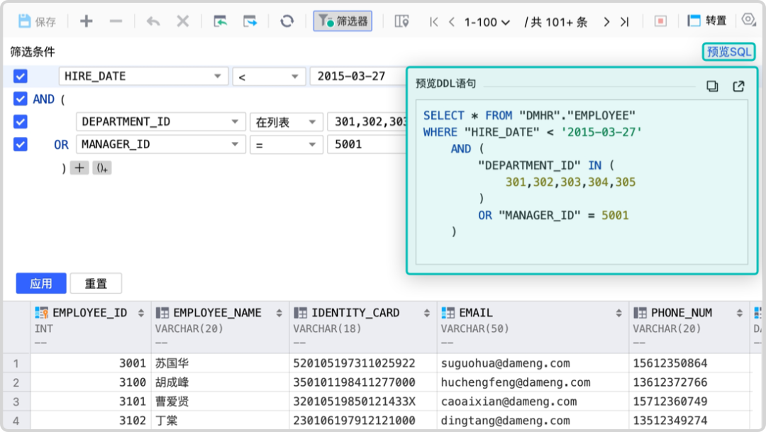 在设置筛选条件时,筛选器支持实时生成对应的 SQL 语句预览,用户可以核对筛选条件设置是否符合预期,也可以复制该 SQL 语句到查询窗口以编写更复杂的查询条件。