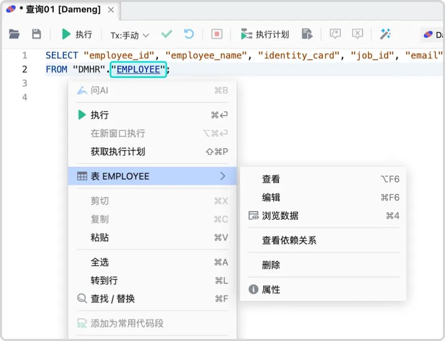 针对 SQL 代码中的表对象增加更多操作。V3.6 之前,对于 SQL 代码中的表对象仅支持通过 Ctrl+鼠标左击 查看 DDL 和属性信息,无法直观查看表结构、表数据等信息;V3.6 扩展对 SQL 代码中的表对象操作,将鼠标光标置于表名位置,右键单击即可调出表操作菜单: