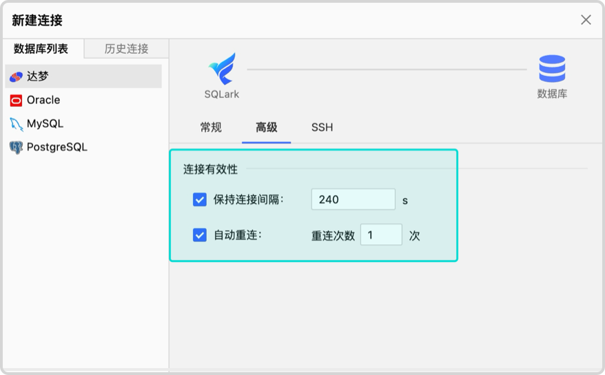 V3.6 之前,当出现网络抖动、或数据库的空闲会话超时时间设置较短的情况下,用户需频繁进行手动重连数据库操作。V3.6 支持在新建/编辑连接时,设置保持连接间隔时间与自动重连次数,保障该连接下的会话在一段时间内没有活动操作的情况下,仍能保持连接有效性。