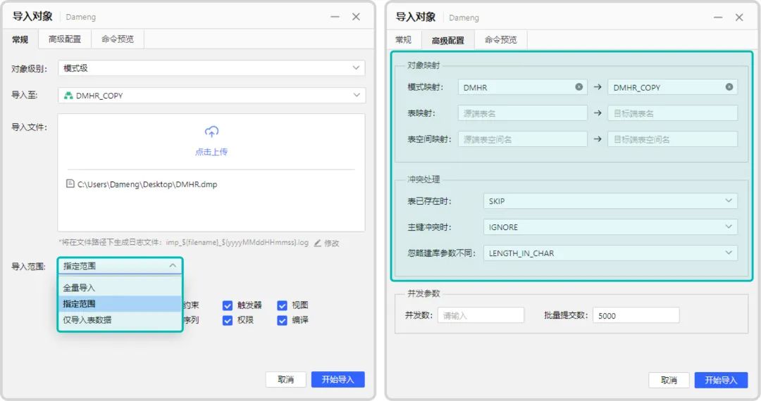V3.6 之前,DM 逻辑导入功能仅支持将数据库对象完整导入至同名模式中,无法实现跨模式备份还原,也不支持自定义导入范围或进行参数配置等。V3.6 版本新增支持更多高级配置: