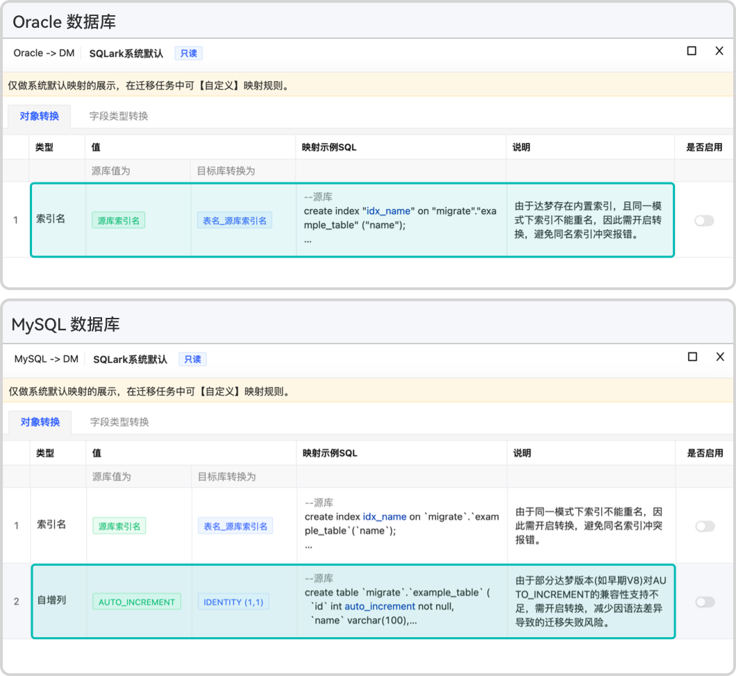 新增支持对象转换功能:当源库为 Oracle 时,支持自定义配置源库索引名转换规则,避免迁到 DM 时发生同一模式下索引同名错误;当源库为 MySQL 时,支持配置自增列转换规则,避免部分达梦版本不兼容 AUTO_INCREMENT 时导致迁移失败的问题。