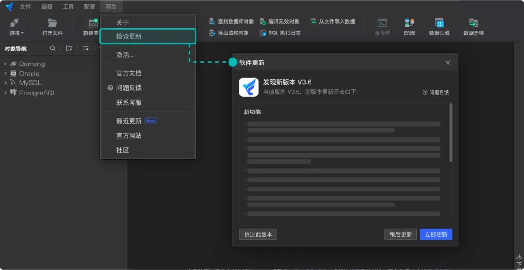在客户端的菜单栏点击 帮助 | 检查更新 选项,选择 立即下载 即可更新至最新版本,也可访问 SQLark 官网 www.sqlark.com 下载最新版本客户端。