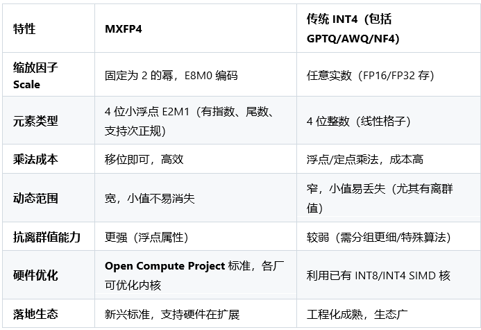 [ INT4 (无符号示例) ] [ E2M1 (FP4) ]┌───┬───┬───┬───┐ ┌───┬───┬───┬───┐│b3 │b2 │b1 │b0 │ ← 4 bits │ S │ E1│ E0│ M0│ ← 4 bits└───┴───┴───┴───┘ └───┴───┴───┴───┘b3..b0 → 整数值 (0~15) S: 符号位 (0=正, 1=负)E1E0: 2-bit 指数(Exponent)M0: 1-bit 尾数(Mantissa)