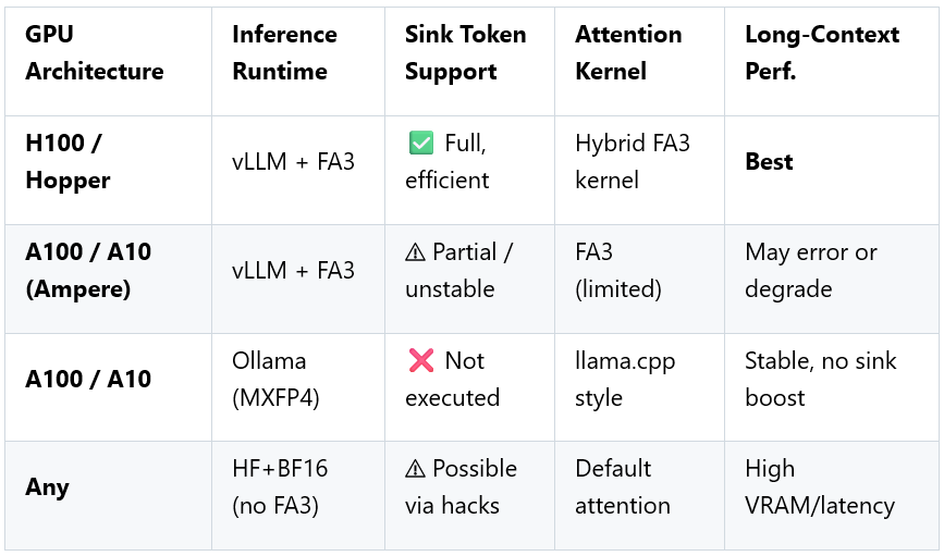 在 gpt-oss 的推理逻辑中引入了 Sink Token。想要高效运行 Sink Token 需要 FA3(FA2 没有相应的内核),Hopper 架构对 FA3 的支持更好,而在 Ampere 上则存在兼容性问题。