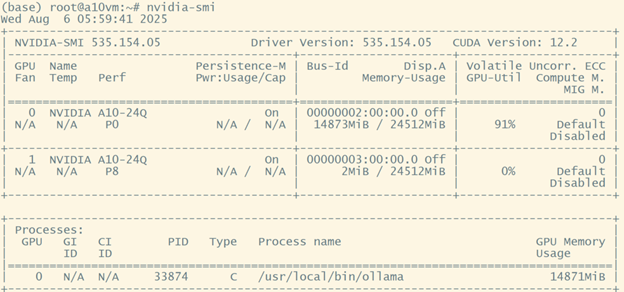 关于这部分测试的说明:只在 Ollama 上使用了单个 A10 GPU。加载模型前如下图所示: