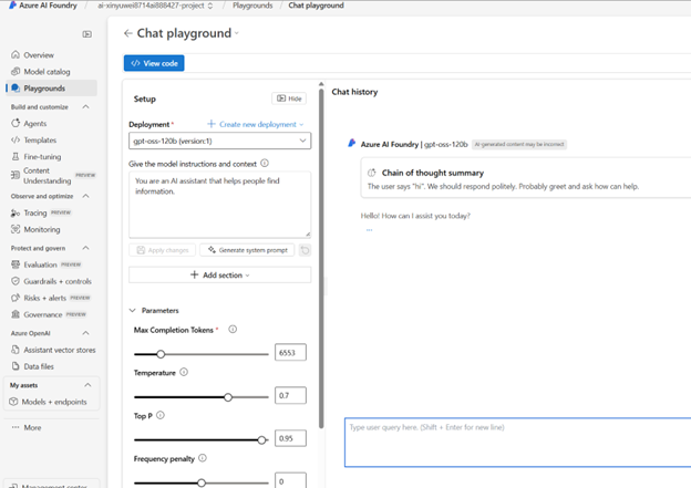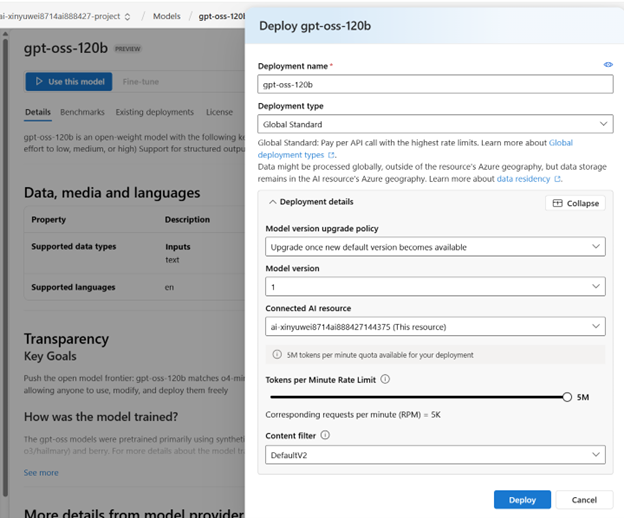gpt-oss-120b 现已在 Azure AI Foundry(国际版)上线,并且可以非常方便的实现一键部署。